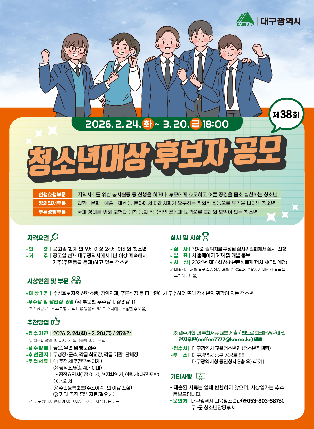 대구광역시에서는 평소 선행효행, 창의인재, 푸른성장 3개 부문에 있어 다른 청소년들에게 귀감이 되는 청소년을 발굴하고자, 제38회 대구광역시 청소년대상 수상 후보자를 다음과 같이 공모합니다.